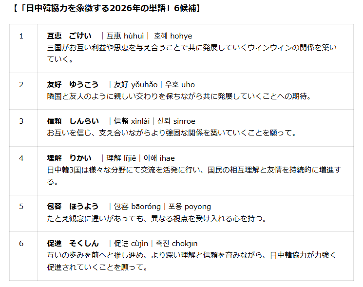 今年は、候補となる6つの単語の中からそれぞれの国で投票を募り、最終的に選ばれた「日中韓協力を象徴する2026年の単語」は、2026年1月1日に公式発表されます。